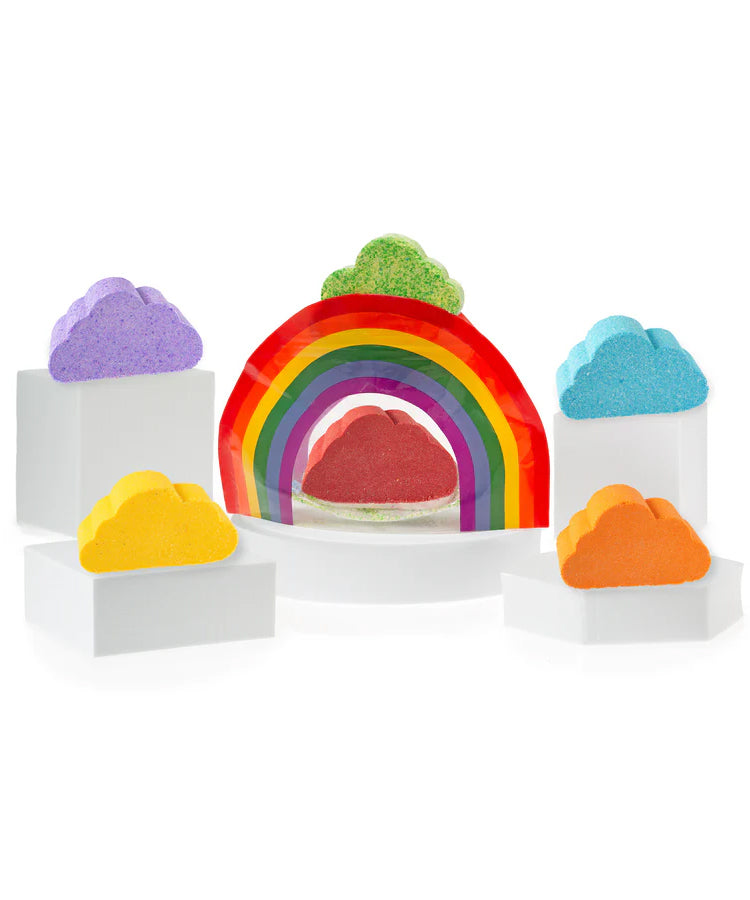 Rainbow bath bomb set. Whatever your bath soak rituals these colorful bath bombs create an invigorating fizzy action that reveals a rainbow of color and an explosion of soothing scents like jasmine, lily of the valley and white musk.