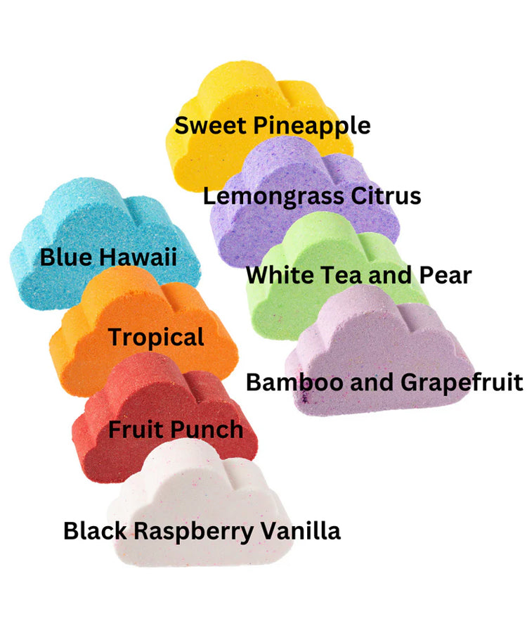(2) 4 oz. colorful bath bomb labeled with ingredients. Current scents fruit punch, sweet pineapple, juicy pear and blue Hawaii